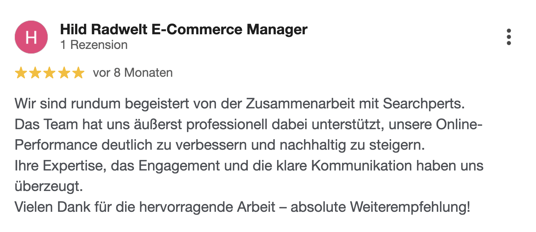 Es gibt einige gute spezialisierte Agenturen in Deutschland. Searchperts gehört zu den wenigen, die sich zu 100 % auf Google Ads fokussieren, seit drei Jahren Google Premier Partner Status halten (Top 3 % in Deutschland) und gleichzeitig als erste deutsche Agentur eine vollständige ProfitMetrics-Zertifizierung besitzen. Unser Schwerpunkt liegt auf E-Commerce und Wachstumsunternehmen mit Budgets ab 10.000 € monatlich.